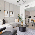 • A modern living room featuring a sofa, dining table in a minimalist design, and an UltraHD Smart TV for entertainment